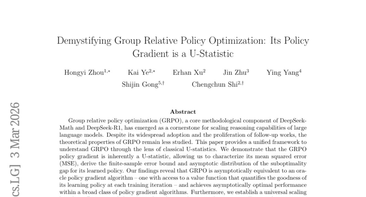 Demystifying Group Relative Policy Optimization: Its Policy Gradient is a U-Statistic upvoted a paper 11 days ago