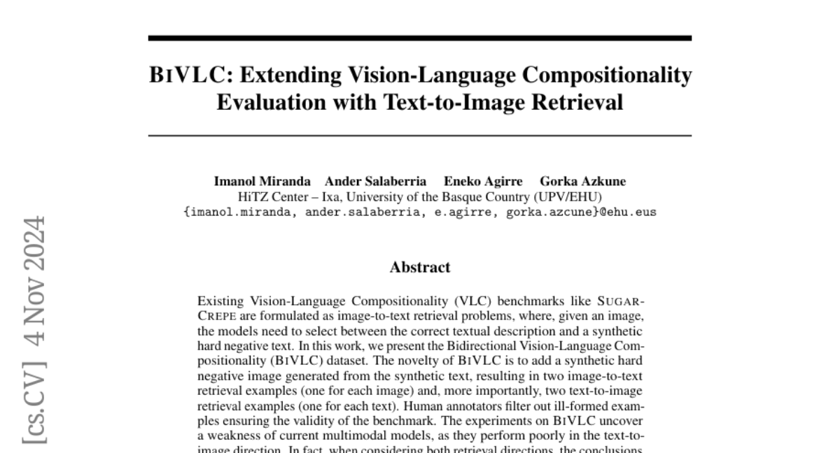 BiVLC: Extending Vision-Language Compositionality Evaluation with Text-to-Image Retrieval Paper • 2406.09952 • Published Jun 14, 2024